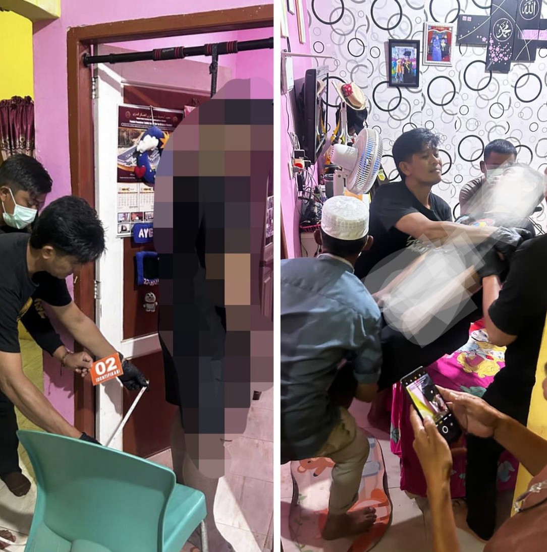 “Saksi M curiga dan memberitaukan kepada saksi AM untuk mengecek kondisi rumah korban. Setelah kedua saksi memasuki rumah korban didapati korban dalam keadaan posisi tergantung di bar pull up koseng pintu kamar sebelah kiri menggunakan tali nilon warna hitam yang terlilit 4 kali di leher korban,” Ungkap IPTU Abdul Hakim.