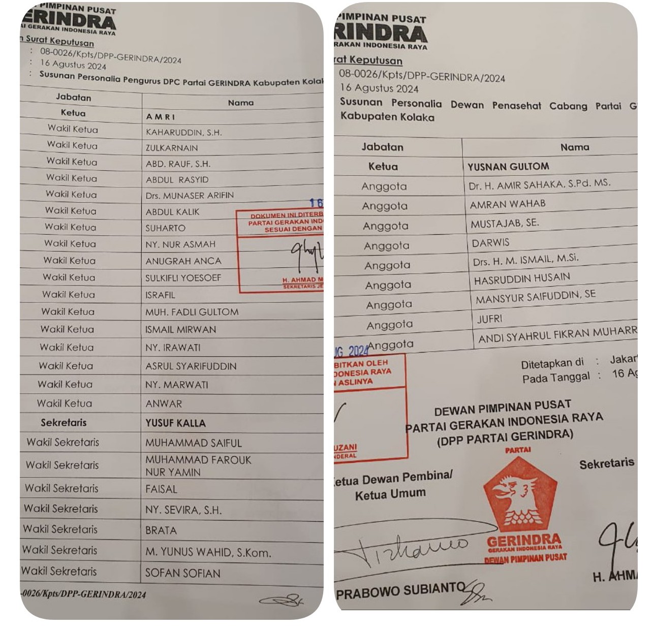Berikut daftar komposisi pengurus DPC Gerindra Kolaka yang baru :